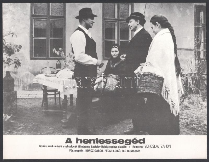 cca 1982 ,,A hentessegéd" című csehszlovák film jelenetei és szereplői (köztük Koncz Gábor, Pécsi Ildikó), 9 db vintage produkciós filmfotó, ofszet nyomdatechnikai eljárással sokszorosítva, egyoldalas nyomással, kartonpapíron, 18x24 cm