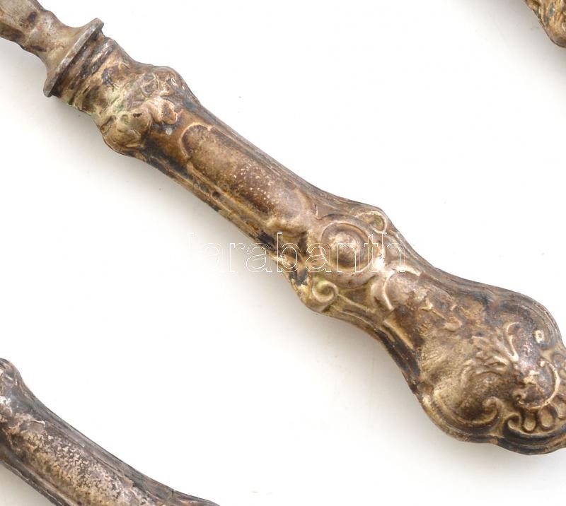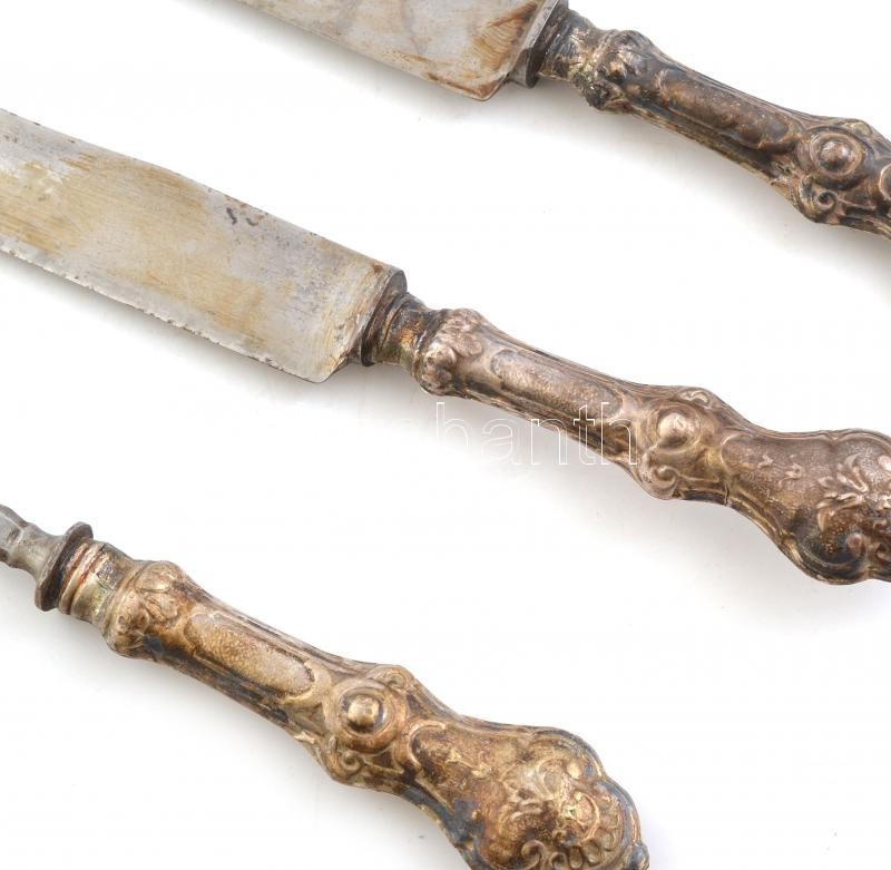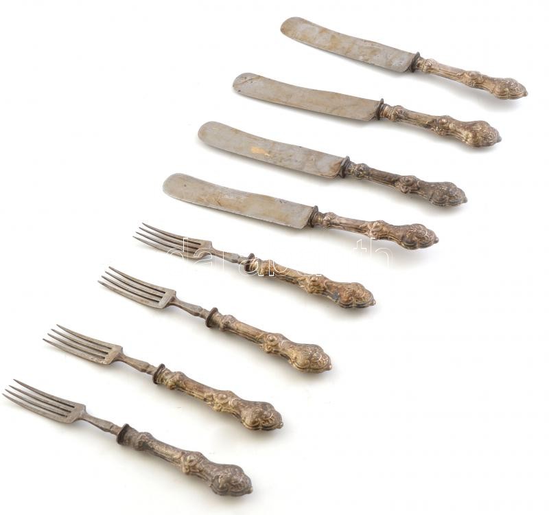 Ezüst (Ag) nyelű villa, 4db, kés, 4db, horpadásokkal, rozsdafoltokkal, részben jelzett, h: 22-25,5cm, cca. nettó: 100 g