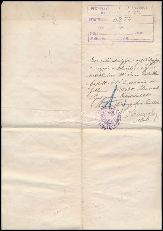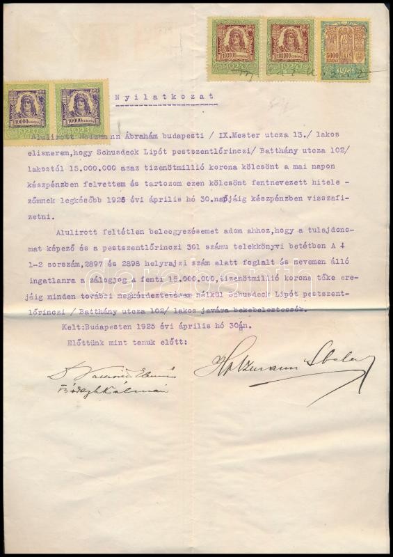 Beschreibung: 1925 Bp., nyilatkozat 15 millió korona kölcsön felvételéről, tanúk aláírásával, 5 db okmánybélyeggel