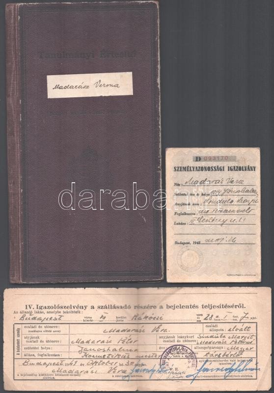 Beschreibung: cca 1926-1944 4 db okmány: 1926-27 Ranolder Intézet Bp., Polgári Leányiskola bizonyítvány, szakadásokkal + 1942-43 Tanulmányi értesítő (bizonyítvány), Bp. IV., Prohászka Ottokár u. + 1945 Igazolószelvény, Bp. + 1945 Személyazonossági igazolvány