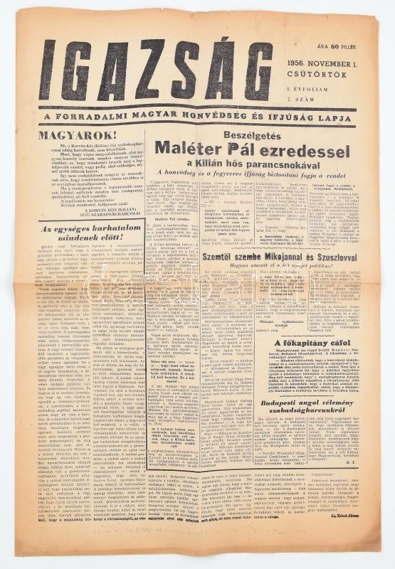 1956 Igazság, a forradalmi magyar honvédség és ifjúság lapja, I. évf. ... https://www.darabanth.com/de/423-Fernauktion/423.0/Kunst-Dokumente-andere-Sammelgebiete/Drucksachen~2000002/1956-Igazsag-a-forradalmi-magyar-honvedseg-es-ifjusag-lapja-I-evf-7-sz-1956-november-~II2693767