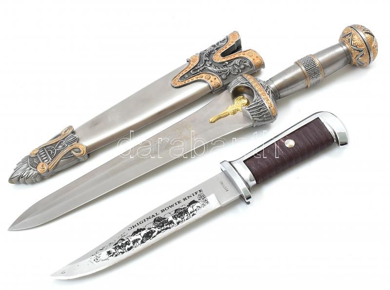 Beschreibung: Díszes fantasy tőr, fém markolattal és hüvellyel, h: 35 cm + Bowie kés, h: 26 cm