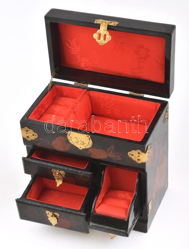 Beschreibung: Ékszerládikó, virágmotívumokkal festett, lakkozott, három fiókkal, fém veretekkel apró kopásnyomokkal, egyik veret sérült, 20x11x19 cm