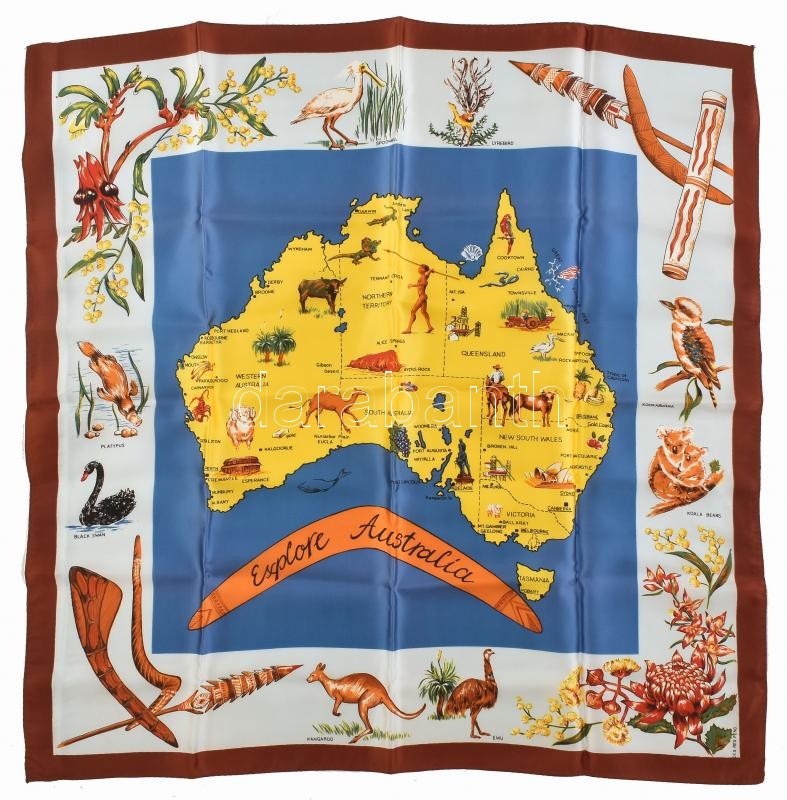 Explore Australia / Ausztrália mintás selyem kendő, kb. 67x67 cm https://www.darabanth.com/de/423-Fernauktion/423.0/Kunst-Dokumente-andere-Sammelgebiete/Flohmarkt~33/Explore-Australia-Ausztralia-mintas-selyem-kendo-kb-67x67-cm~II2691973