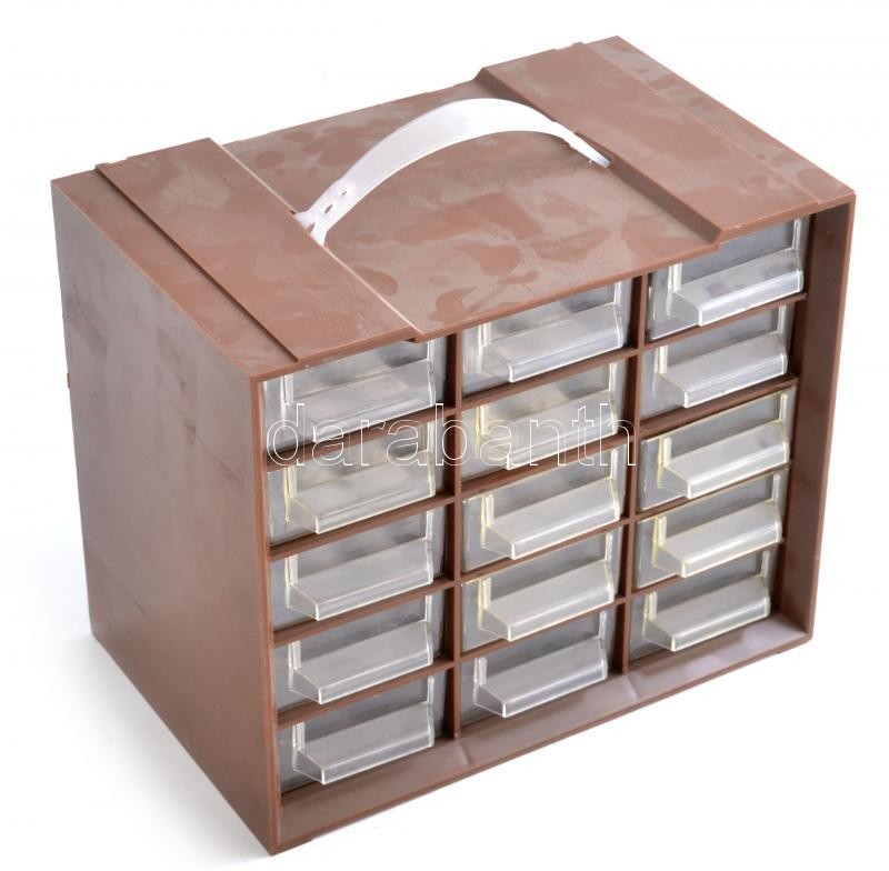 Beschreibung: Műanyag szerelvénytartó, 15 darab fiókkal. Használt jó állapotban (~20,x24x15cm)