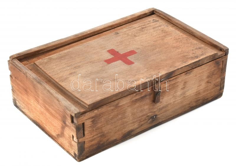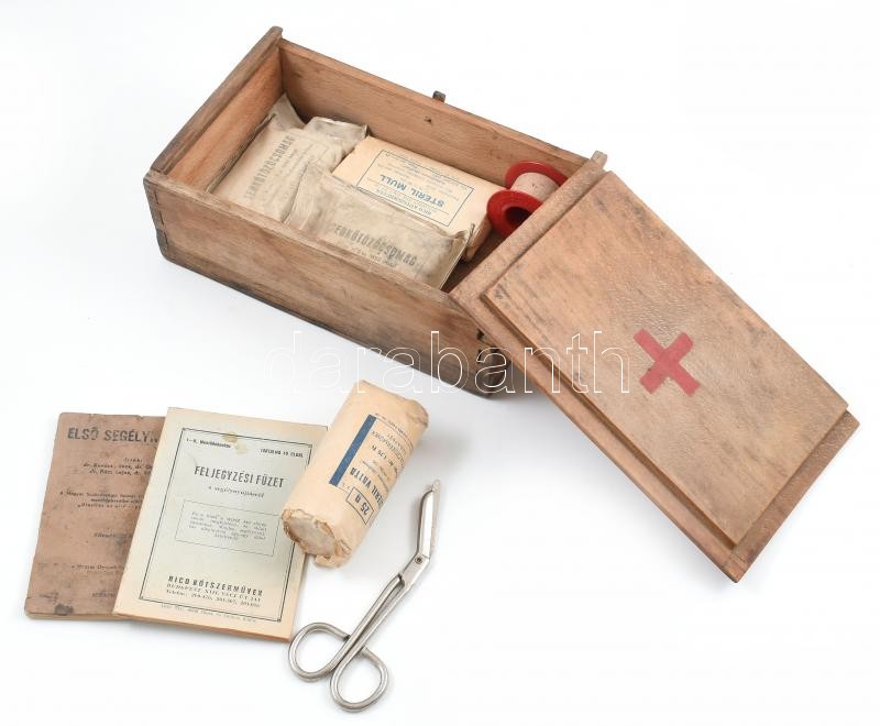 Retró fa elsősegély doboz, mentődoboz, 1950-es évek, benne tartozékai (Elsősegélynyújtás útmutató könyv, feljegyzési füzet, steril vatta, mull kötszer, 2 db sebkötözőcsomag, kötszervágó olló, Leukoplast ragtapasz). Korának megfelelő állapotban, 25x16x8 cm