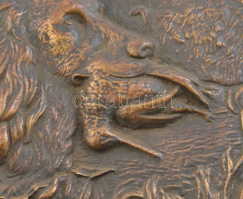 Beschreibung: Vadászkutya vízimadár zsákmánnyal. Réz dombormű (falikép). Jelzés nélkül. 21,5x29 cm