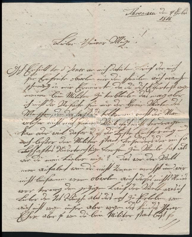 1816 Trencsén, német nyelvű levél olvashatatlan címzettel és aláírással, 3 beírt oldal / 1816 Trencin (Slovakia), letter in German language, unknown writer and recipient, 3 pages