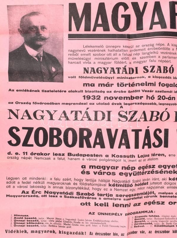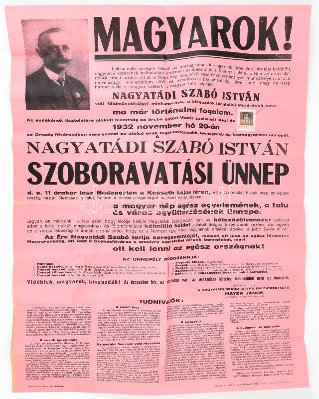 Beschreibung: 1932 Nagyatádi Szabó István kisgazda politikus és miniszter Kossuth téri szobrának leleplezésére hívó plakát 48x62 cm Hajtva