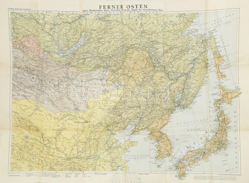 1937 Freytag & Berndt's Handkarte: Ferner Osten. Japan, Mandschukuo, Korea, Nordchina, Mongolei, Gebiet der transsibirschen Bahn. / Távol-Kelet (Japán, Mandzsukuo, Korea, Észak-Kína, Mongólia, a Transzszibériai vasútvonal területe) térképe. 1 : 6.000.000. Kartograpische Anstalt Freytag & Berndt, Wien. Hajtva, 74x55 cm