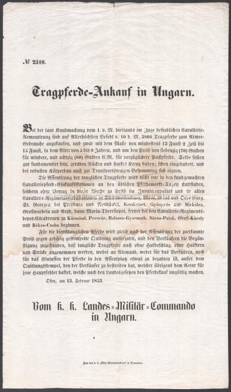 1853 Ofen, Tragpferde-Ankauf in Ungarn, K. K. Landes-Militär-Commando / Buda, teherhordó lovak vására, a magyarországi cs. és kir. katonai parancsnokság hirdetménye, német nyelven, ázásnyommal