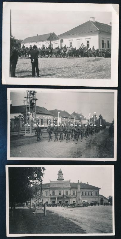 Beschreibung: cca 1940 Ada, Szerbia, katonai bevonulás, 3 db fotó, 6,5×9,5 cm