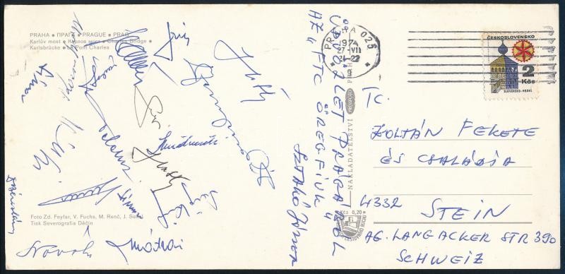 1974 Prágából magyar labdarúgók által hazaküldött képeslap autográf aláírásaikkal: Mátrai Sándor, Novák Dezső, Fenyvesi Máté, és mások / Autograoh signed postcard of world class Hungarian footbalisist