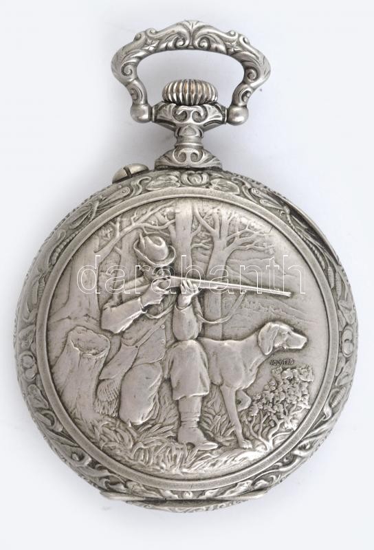 Beschreibung: Doxa nagy méretű zsebóra, vadász motívummal. Sérült számlappal, működő, jó állapotban d: 70 mm