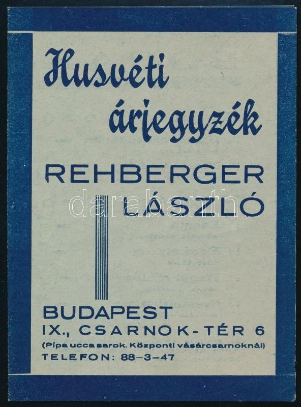 cca 1930-1940 Húsvéti árjegyzék, Rehberger László Bp., borok és likőrö... https://www.darabanth.com/de/423-Fernauktion/423.0/Kunst-Dokumente-andere-Sammelgebiete/Werbungen~45/cca-1930-1940-Husveti-arjegyzek-Rehberger-Laszlo-Bp-borok-es-likorok-arjegyzeke-4-p~II2686827
