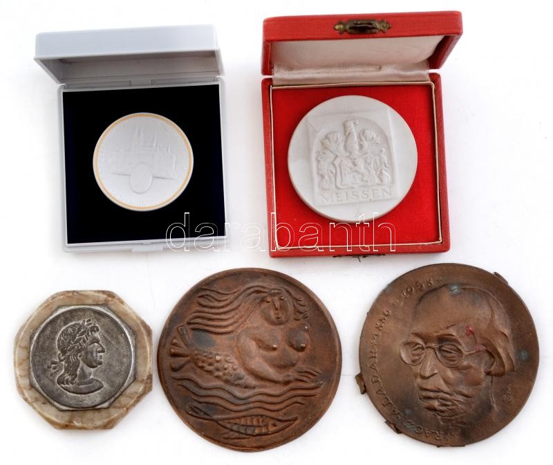 5xklf magyar és külföldi emlékplakettből és -éremből álló tétel, közte DN "Mátyás király" talapzatra erősítve (53x53mm) + 2xklf meisseni porcelán érem tokban T:1--3