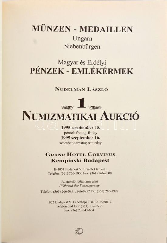 Hungary László Nudelman: 1st Numismatic Auction - Hungarian and Transylvanian Coins and Medallions - 1995. September 15-16. Grand Hotel Corvinus Kempinski Budapest. In used, good condition.