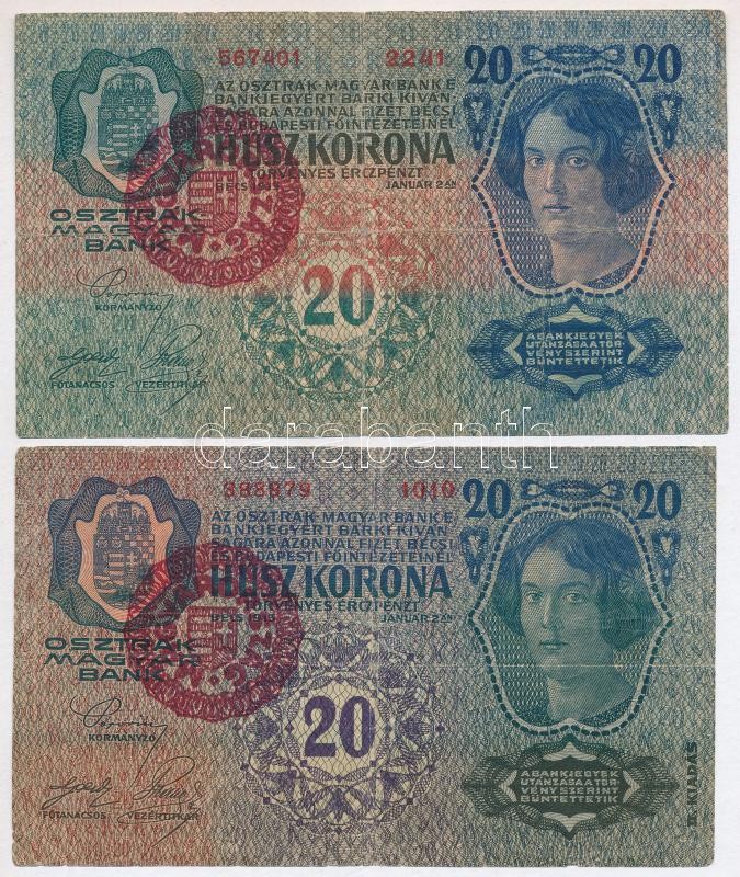 1913. 20K (2xklf: I. és II. kiadás) mindkettő piros "MAGYARORSZÁG... https://www.darabanth.com/de/423-Fernauktion/423.0/Numismatik/Ungarische-Banknoten~6000007/1913-20K-2xklf-I-es-II-kiadas-mindketto-piros-MAGYARORSZAG-felulbelyegzessel-TIII--~II2687408