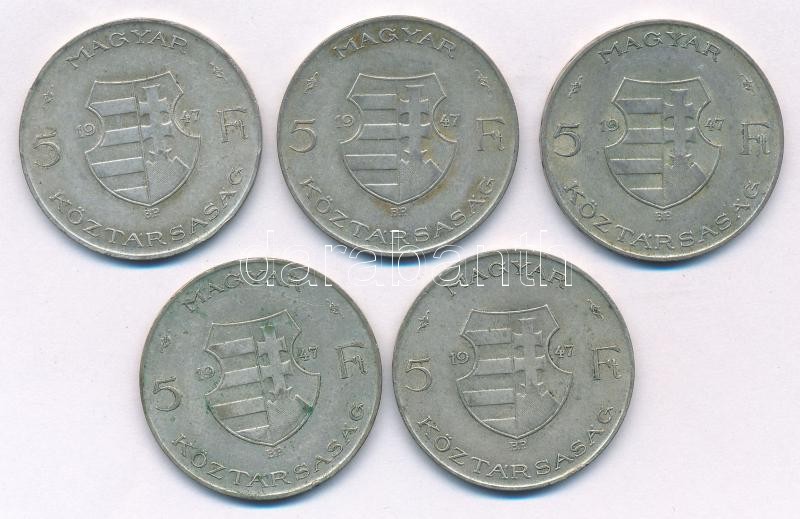 1947. 5Ft Ag "Kossuth" (5x) T:2,2- patina Adamo F8.1 https://www.darabanth.com/de/423-Fernauktion/423.0/Numismatik/Ungarische-Munzen-und-Munzen-mit-ungarischem-Munzzeichen~6000008/1947-5Ft-Ag-Kossuth-5x-T2-2-patina-Adamo-F81~II2686111