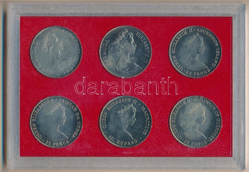 Brit Birodalom 1981. Lady Diana és Károly esküvőjére kiadott 6xklf Cu-Ni forgalmi emlékérme dísztokban, közte Mauritius, Gibraltár, Guenrsey T:1,1- British Empire 1981. 6xdiff Cu-Ni commemmorative coins for the weddign of Lady Diana and Prince Charles, in case, with Mauritius, Gibraltar, Guernsey C:UNC,AU
