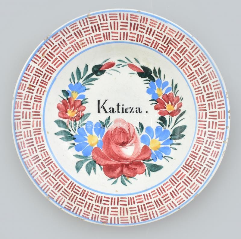 Apátfalva jelzett népi tányér, Katicza névvel, kézzel festett cserép, ... https://www.darabanth.com/de/423-Fernauktion/423.0/Porzellan-Keramik-Glass/Porzellan~27/Apatfalva-jelzett-nepi-tanyer-Katicza-nevvel-kezzel-festett-cserep-kopott-mazrepedesekk~II2685985
