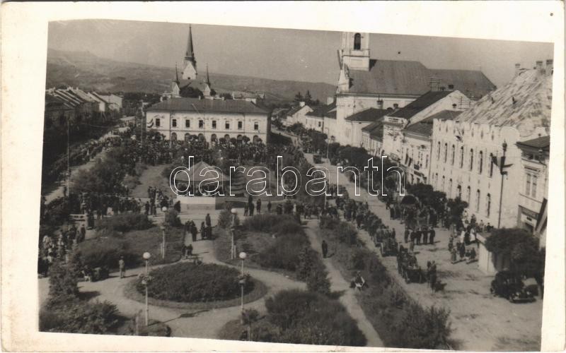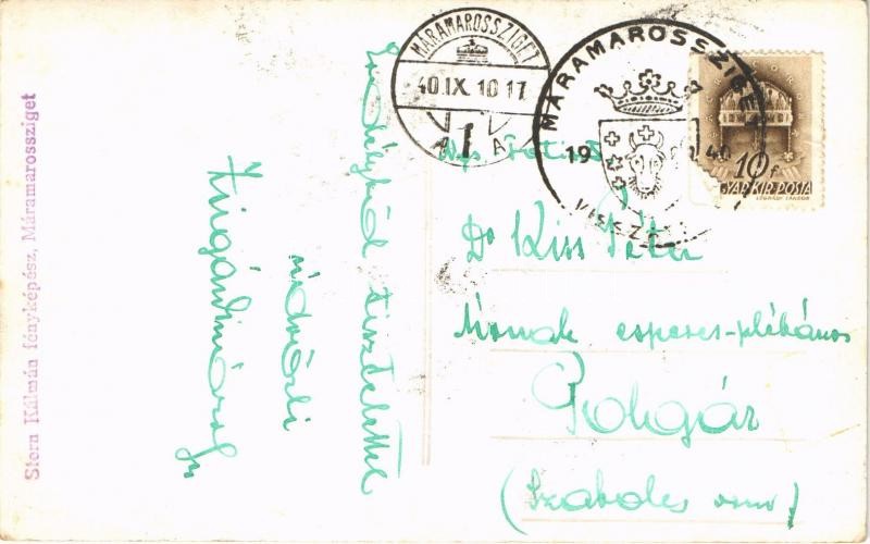 Beschreibung: 1940 Máramarossziget, Sighetu Marmatiei; bevonulás, magyar zászlók / entry of the Hungarian troops, Hungarian flags. Stern Kálmán photo + "1940 Máramarossziget visszatért" So. Stpl.