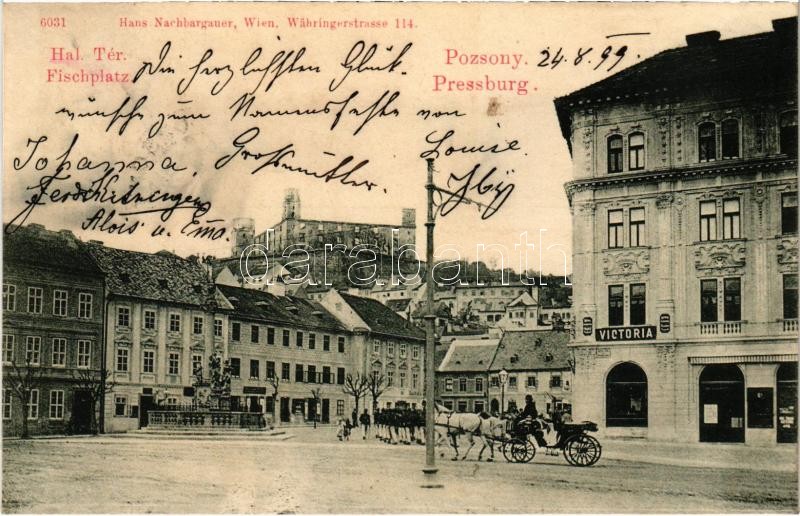 Beschreibung: 1899 (Vorläufer) Pozsony, Pressburg, Bratislava; Hal tér, Victoria szálloda. Hans Nachbargauer / Fischplatz / Rybné námestie / square, hotel (r)