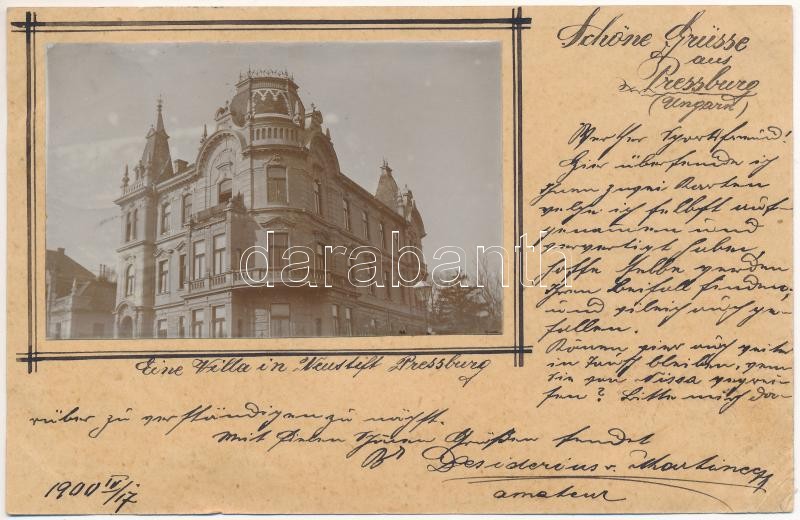 1900 Pozsony, Pressburg, Bratislava; Újtelepi villa / Eine Villa in Ne... https://www.darabanth.com/de/424-Fernauktion/424.0/Ansichtskarten/Slowakei~1000007/1900-Pozsony-Pressburg-Bratislava-Ujtelepi-villa-Eine-Villa-in-Neustift-Kuzmanyho-ulica-ph~II2698396