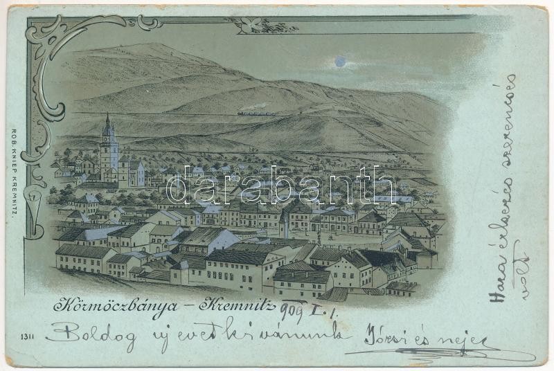 Beschreibung: 1909 Körmöcbánya, Kremnitz, Kremnica; látkép, vasútvonal, gőzmozdony, vonat / general view, railway line with locomotive, train. Rob. Kniep 1311. Art Nouveau, litho (EK)