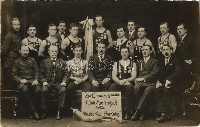 1922 Pozsony, Pressburg, Bratislava; Zur Erinnerung an die Klub Meisterschaft Athleten club Herkules / Herkules sportolók klubja, sportolók érmekkel. Apfel Otto L. / Athletes Club Hercules, athletes with medals. group photo