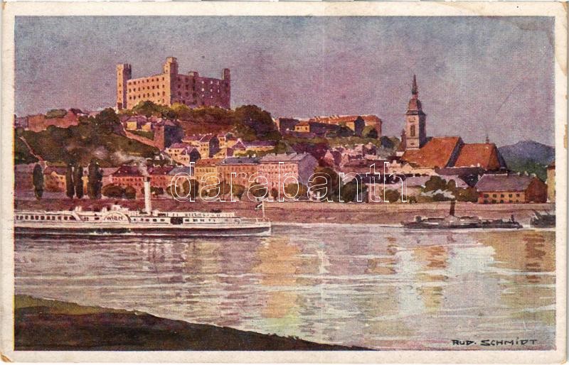 Beschreibung: Pozsony, Pressburg, Bratislava; vár, "WIEN" oldalkerekes gőzhajó. Első Cs. kir. szab. Duna-Gőzhajózási Társaság művészlapja / castle, steamship s: Rud. Schmidt