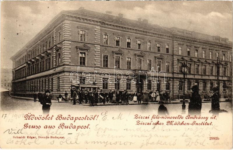 Beschreibung: 1900 Budapest VI. Zirci-féle leány növelde az Andrássy út 65. sz. alatt, omnibusz (EK)