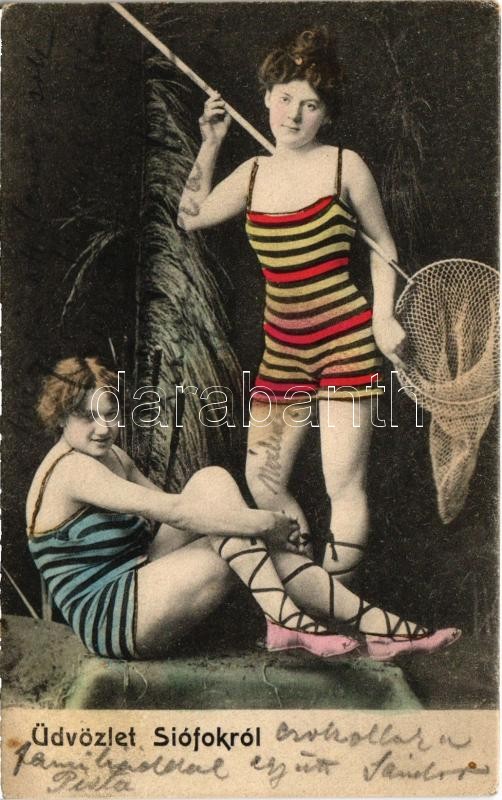 1904 Siófok, hölgyek korabeli fürdőruhában merítőhálóval https://www.darabanth.com/de/424-Fernauktion/424.0/Ansichtskarten/Ungarn~1000005/1904-Siofok-holgyek-korabeli-furdoruhaban-meritohaloval~II2698078