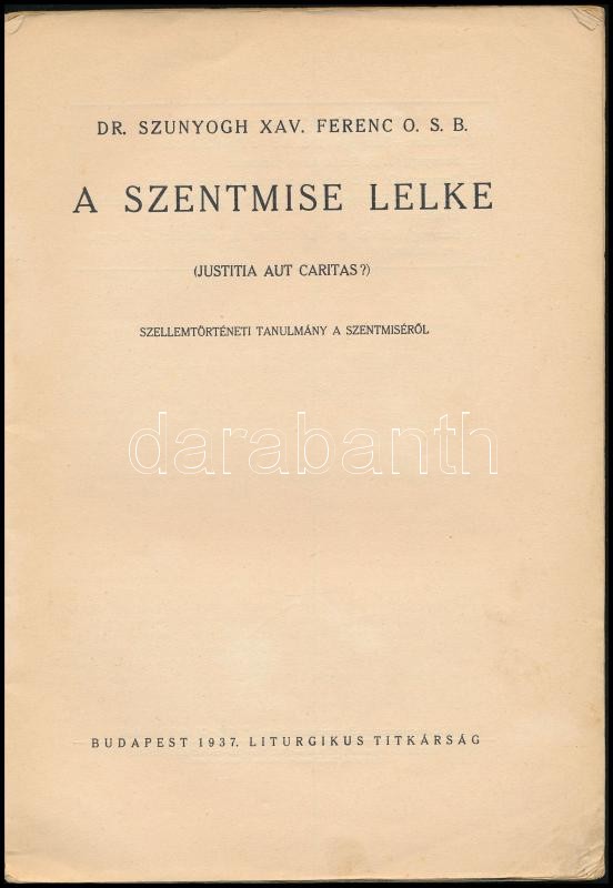 Dr. Szunyogh Xav. Ferenc: A szentmise lelke. Szellemtörténeti tanulmány a szentmiséről. Ecclesia Orans VI. (Különlenyomat a "Pannonhalmi Szemle" 1935-36. évfolyamából). Bp., 1937, Liturgikus Titkárság (Sárkány-ny.), 72 p. Sérült papírkötésben, hiányzó elülső borítóval, ragasztott gerinccel, helyenként kissé foltos.