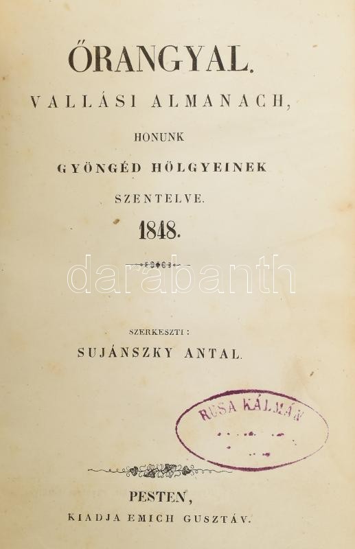 Őrangyal. Vallási almanach honunk gyöngéd hölgyeinek szentelve. 1848. Szerk:: Sujánszky Antal. Pest, 1848, Emich Gusztáv, 1 (hártyapapírral védett címkép, acélmetszet) t.+2+403+2 p.+ 2 (hártyapapírral védett acélmetszetek) t. Utolsó évfolyam! Korabeli kopott egészvászon-kötés, festett lapélekkel, kissé foxing foltos lapokkal, possessori bélyegzéssel, egy hiányzó táblával. Ritka!