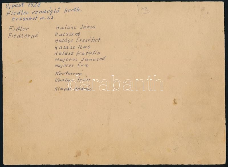 1928 Újpest, Fiedler vendéglő kerthelyisége (Erzsébet u. 22.) a tulajdonosokkal és vendégekkel (hátoldalon nevesítve), feliratozott fotó kartonon, kis sérüléssel, 22,5x17 cm