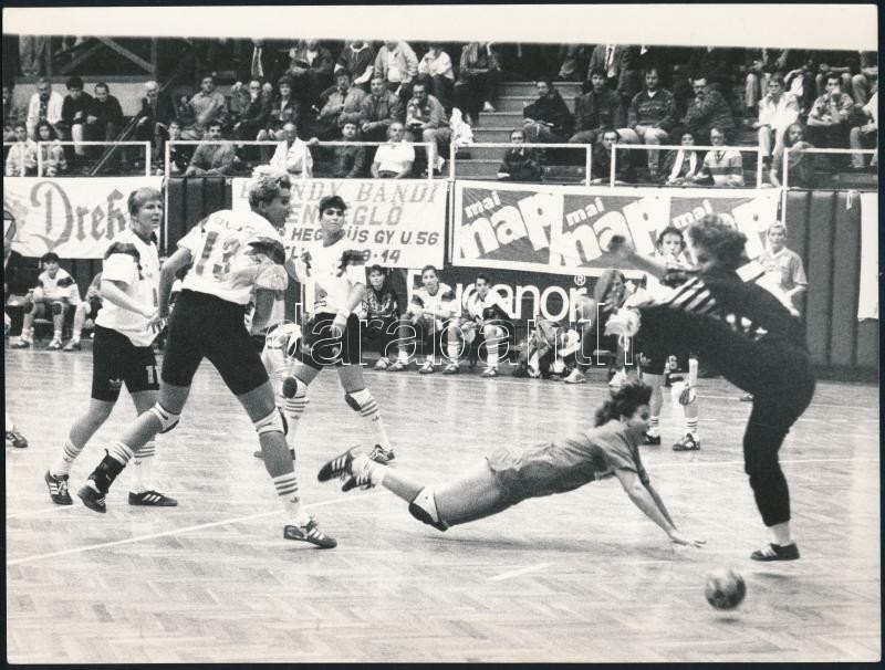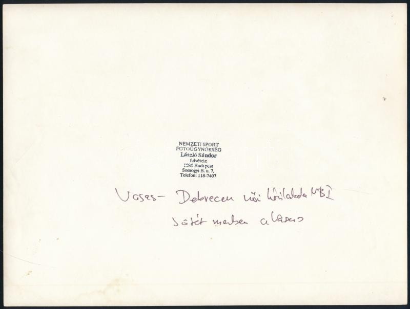 Beschreibung: cca 1980 Vasas - Debrecen női kézilabda mérkőzés fotója, Nemzeti Sport fotó, László Sándor felvétele, a hátoldalán pecséttel jelzett, 18x24 cm