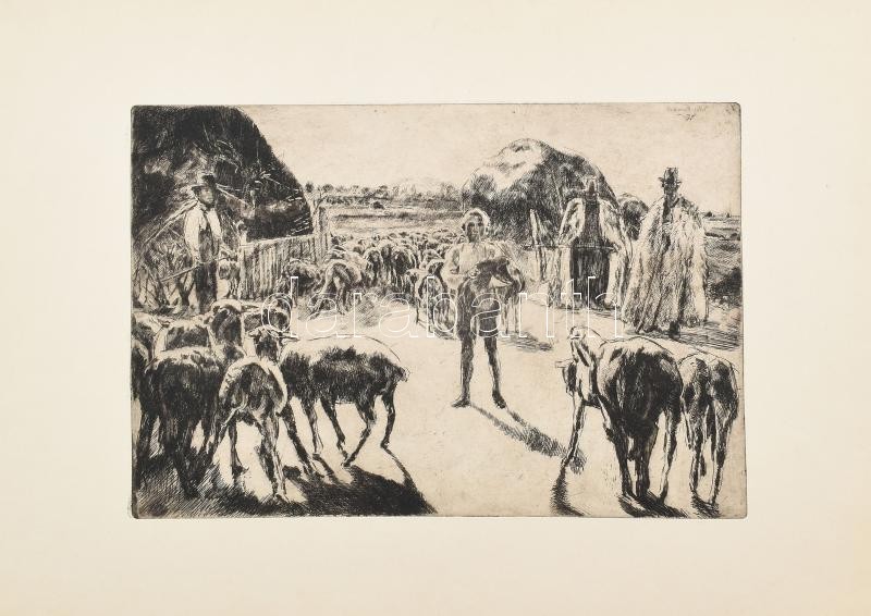 Beschreibung: Aszódi Weil Erzsébet (1901-1976): Pásztorok (cím nélkül). Rézkarc, papír, jelzés nélkül. Lap széle kissé sérült. 24,5×36,5 cm