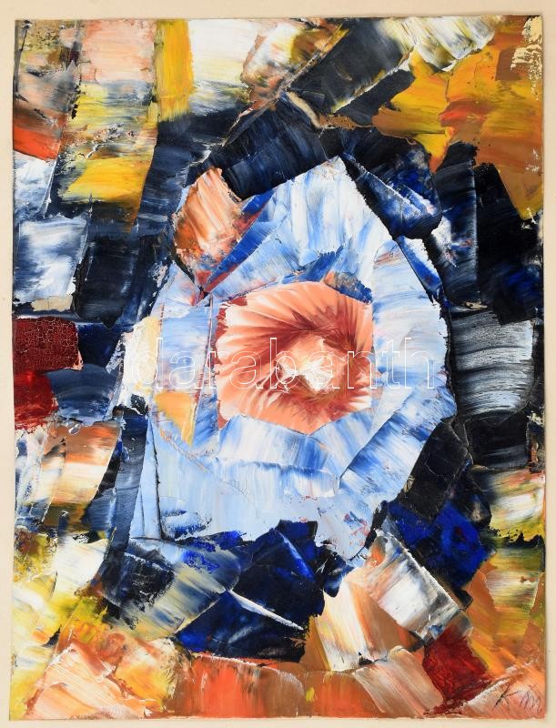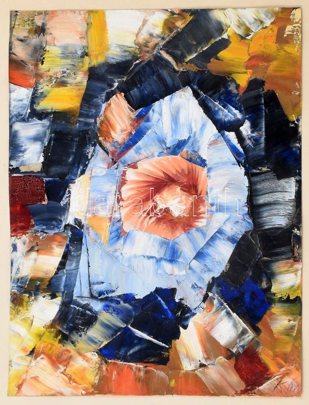 Körtvélyessy Magda (1919-2007): Színes kép (cím nélkül). Olaj, papír, jelzett, kartonra kasírozva, hátoldalán autográf ajándékozási sorokkal a Soós család részére, 20x15 cm. Soós Imre (1921-2013) műgyűjtő, művészeti író, a Kisgrafika folyóirat szerkesztője, a Magyar Nemzeti Galéria Baráti Köre alelnökének hagyatékból.