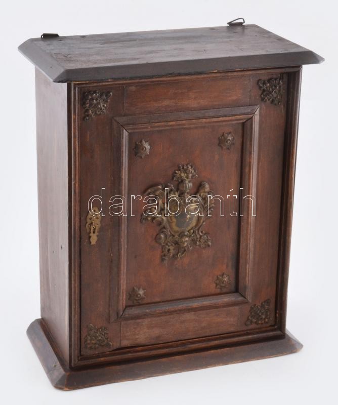 Régi fa fali téka (szekrény), díszes fém veretekkel, belsejében polcok... https://www.darabanth.com/de/424-Fernauktion/424.0/Kunst-Dokumente-andere-Sammelgebiete/Antik~500008/Regi-fa-fali-teka-szekreny-diszes-fem-veretekkel-belsejeben-polcokkal-serult-kopott-f~II2699442