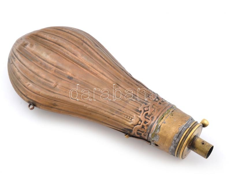 Réz lőportartó, XIX. sz., jelzett, nyakán florális motívumokkal díszít... https://www.darabanth.com/de/424-Fernauktion/424.0/Kunst-Dokumente-andere-Sammelgebiete/Antik~500008/Rez-loportarto-XIX-sz-jelzett-nyakan-floralis-motivumokkal-diszitett-kisebb-serules~II2699134