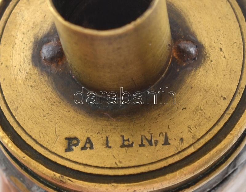 Beschreibung: Réz lőportartó, XIX. sz., jelzett, nyakán florális motívumokkal díszített, kisebb sérülésekkel, horpadásokkal, forrasztott, h: 19,5 cm