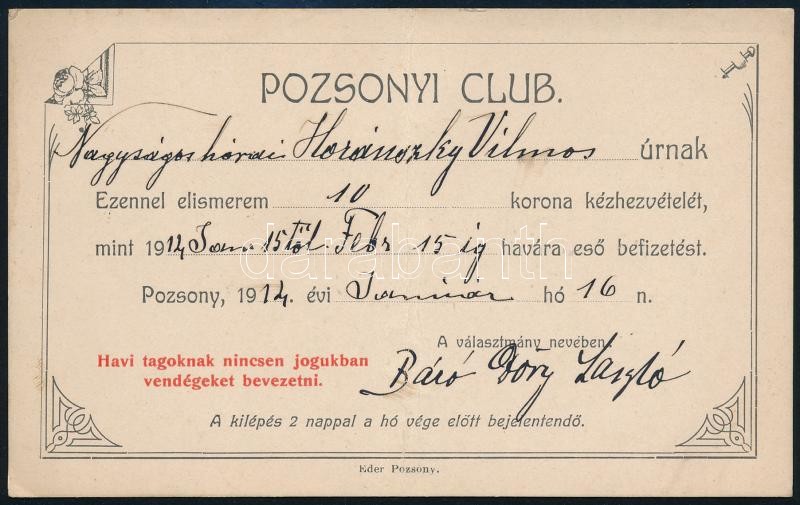 1914 hórai Horánszky Vilmos (1893-1915) nyugtája tagdíj fizetésről a P... https://www.darabanth.com/de/424-Fernauktion/424.0/Kunst-Dokumente-andere-Sammelgebiete/Dokument~500018/1914-horai-Horanszky-Vilmos-1893-1915-nyugtaja-tagdij-fizetesrol-a-Pozsonyi-Clubtol-baro~II2699889