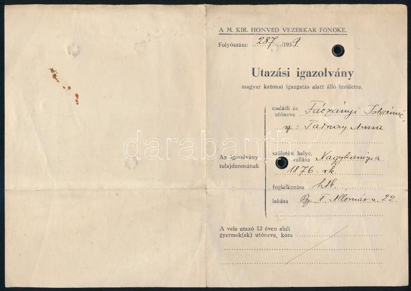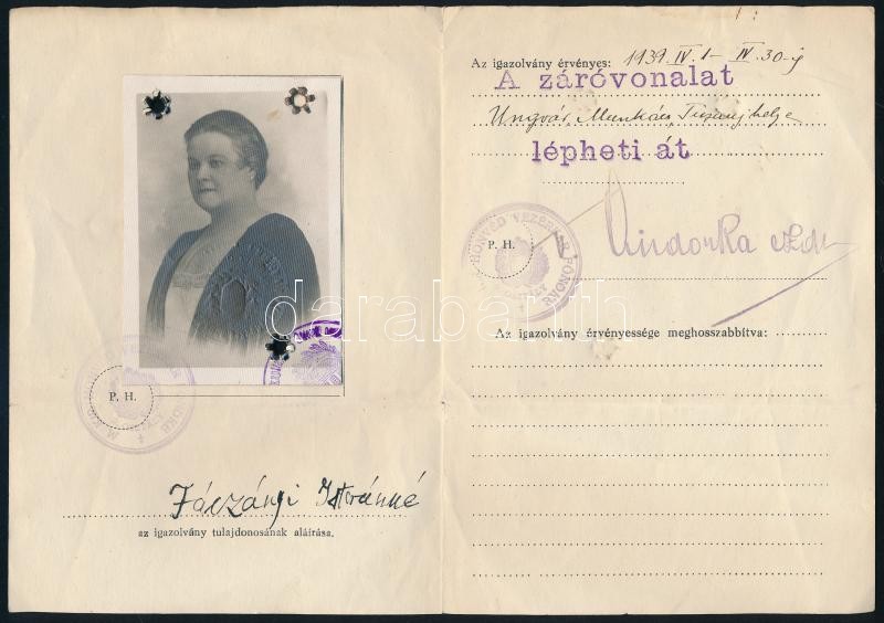 1939 A M. kir. Honvéd Vezérkar főnöke által 1 hónapra (április) kiadott fényképes utazási igazolvány a kárpátaljai záróvonal (határszakasz) civil személy részére 3 helyen történő átlépésre, hajtással, pecsételve, jó állapotban