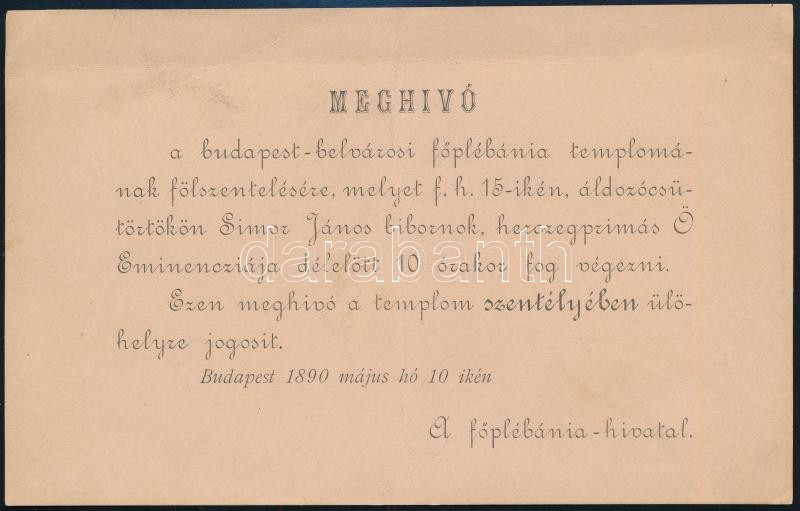 1890 Bp., Meghívó a budapest-belvárosi főplébánia templomának fölszent... https://www.darabanth.com/de/424-Fernauktion/424.0/Kunst-Dokumente-andere-Sammelgebiete/Drucksachen~2000002/1890-Bp-Meghivo-a-budapest-belvarosi-foplebania-templomanak-folszentelesere-kozepen-t~II2697016