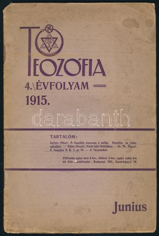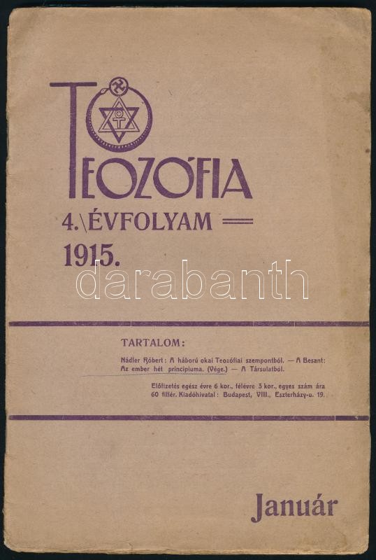 1915 Teozófia, a Magyar Teozófiai Társulat lapja 4. év. 1 és 6. sz., Szerk.: dr. Rózsaffy Dezső. Bp., Károlyi György kő- és könyvnyomdája, Szabadkőműves folyóirat