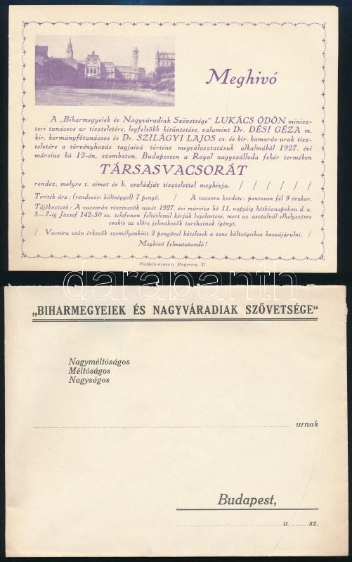Beschreibung: 1927 Biharmegyeiek és Nagyváradiak Szövetségének társasvacsorára szóló meghívója, borítékkal