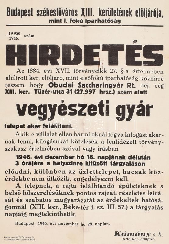 1946 XIII. kerületi vegyészeti gyár felállításának hirdetménye 30x46 c... https://www.darabanth.com/de/424-Fernauktion/424.0/Kunst-Dokumente-andere-Sammelgebiete/Drucksachen~2000002/1946-XIII-keruleti-vegyeszeti-gyar-felallitasanak-hirdetmenye-30x46-cm~II2700881
