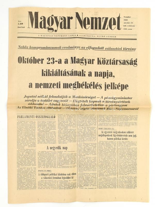 1989 Magyar Nemzet LII. évf. 248. sz., 1989. okt. 21. "Október 23-a a Magyar Köztársaság kikiáltásának a napja, a nemzeti megbékélés jelképe." Szerk.: Soltész István. Bp., Athenaeum, 16 p.