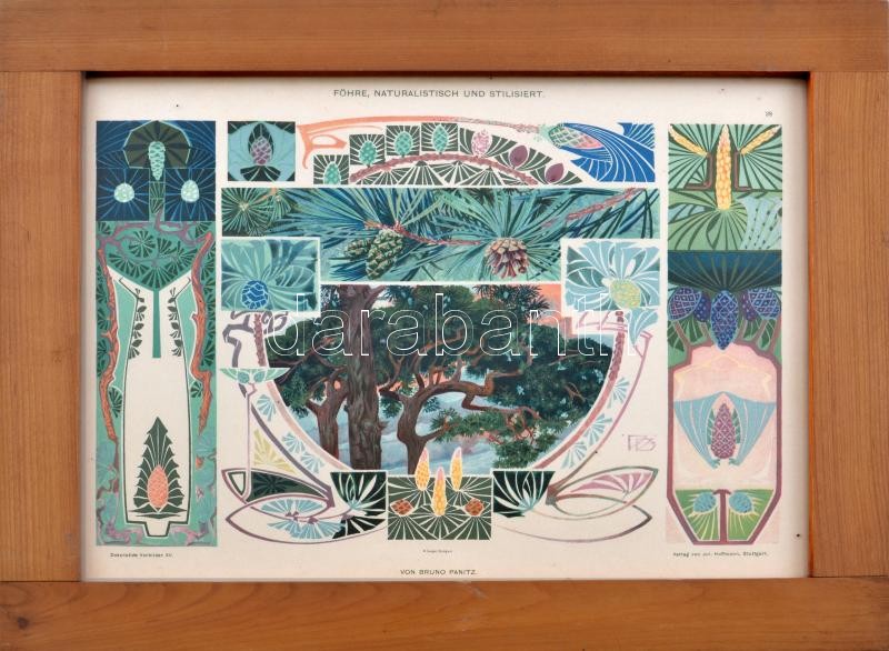 Beschreibung: cca 1905 Jugendstil (szecessziós) florális ornamentika (erdei fenyő), a Dekorative Vorbilder sorozatból, Bruno Panitz munkája, nyomat, papír. 24,5x33 cm, üvegezett fakeretben